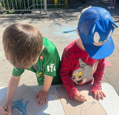 Hluti af börnunum lék sér með sól og skugga í dalnum. Þau fóru með plastdýr í dalinn og notuðu sólina til að búa til skugga á pappír sem þau teiknuðu svo eftir. Bæði krefjangi og skemmtilegt verkefni.