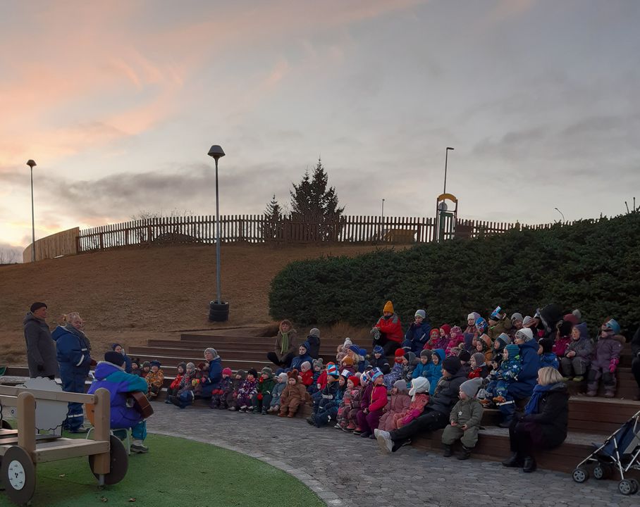 Sæl öll, við fögnuðum Degi íslenskrar tungu með samsöng í garðinum, kalt en gaman. Sungum m.a. nokkrar ferskeytlur, Á íslensku má alltaf finna svar og Buxur, vesti, brók og skór.